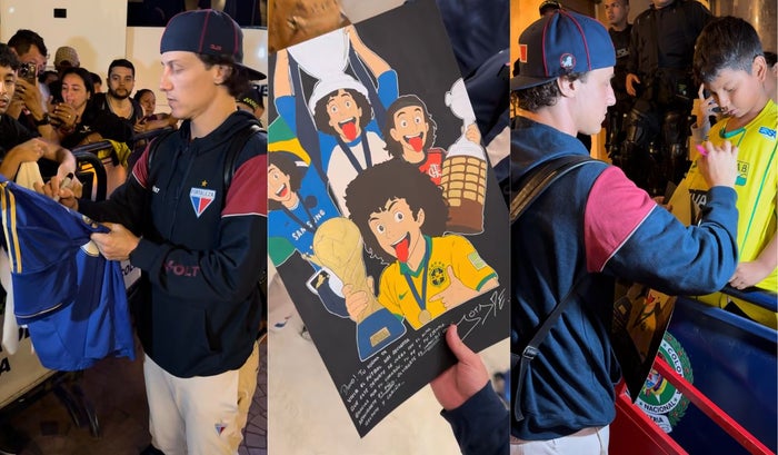 El defensor central, que completa cerca de 20 años como futbolista profesional, es uno de los referentes del equipo brasileño, y es también el más reconocido de la plantilla, por ese motivo en la llegada a la capital santandereana hubo un grupo de aficionados que lo esperó para conocerlo y guardar un recuerdo con un futbolista que tiene una gran trayectoria internacional.