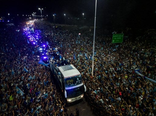 Con teléfonos móviles que iluminaban la negra noche, los aficionados seguían el recorrido del autobús con banderas argentinas, bengalas y fuegos de artificio y lanzando cartas y balones a los futbolistas.
