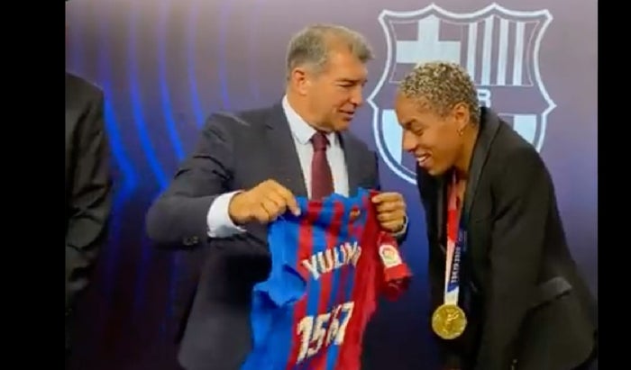 El Camp Nou homenajeó en los prolegómenos del partido ante el Getafe a las jugadores del Barca femenino premiadas esta semana por la UEFA, con la capitana Alexia Putellas al frente como mejor futbolista europea, y a la atleta venezolana Yulimar Rojas, que se proclamó campeona olímpica de triple salto batiendo el récord del mundo en los Juegos Olímpicos de Tokio.