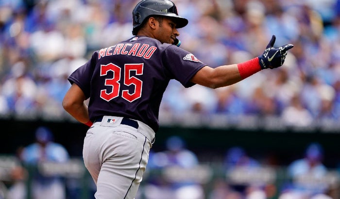 El colombiano Óscar Mercado agregó este lunes un jonrón, el segundo en día consecutivo, para que los Guardianes de Cleveland vencieran en las Grandes Ligas a los Reales de Kansas City 10x7, mientras que el novato Steven Kwan cumplió otra vez.