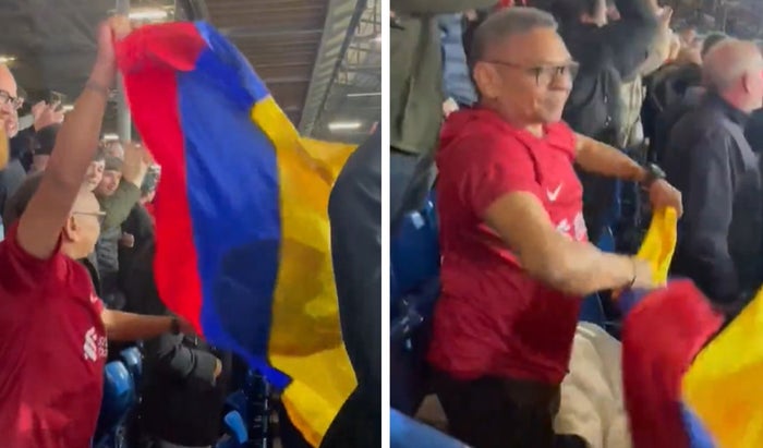 Con la camiseta '23' de Liverpool -marcada con el nombre de su hijo- y una bandera de Colombia, el padre Luis Díaz se robó el show en la tribuna, pues los aficionados Reds aplaudieron su acción e incluso se sumaron a la euforia transmitida.