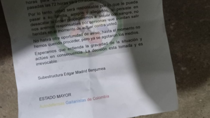 En el panfleto se le da un plazo de 72 horas para abandonar el territorio de Santander. Pasado ese tiempo, sería considerada objetivo militar por la subestructura denominada como Edgar Madrid Benjumea que opera en esta región.