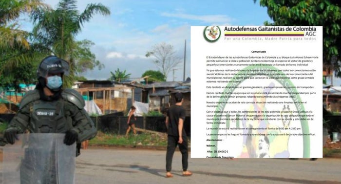 “Ya que estamos realizando las labores de limpieza social sabemos que todos los comerciantes están siendo víctimas de la delincuencia común, el objetivo es que cada uno de los comerciantes del municipio nos realicen su aporte para que conozcan la labor que nosotros como grupo armado estamos realizando en la zona”, cita el documento que firma alias ‘El choco’.