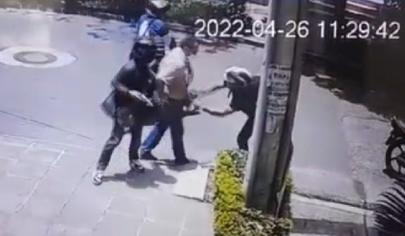 Este atraco quedó registrado en cámaras de seguridad del barrio Sotomayor en la calle 44 con carrera 28 en Bucaramanga, en el que se observa como un ciudadano quien va caminando, es sorprendido primero por dos sujetos, la víctima trata de huir, y de frente le llegan otros motociclistas quienes lo acorralan como buitres.