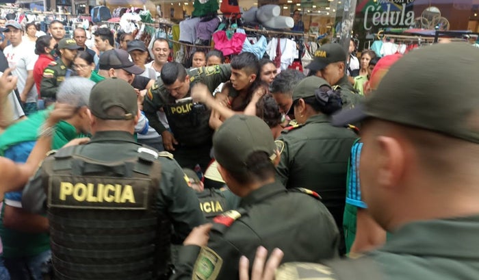 En estos actos un joven de 17 años, identificado como Keiner David Montoya Meneses, fue trasladado a la comisaría de familia al momento que agredió a un policía que le solicitó a su mamá reducir la ocupación del puesto de venta que tiene en el Paseo del Comercio.