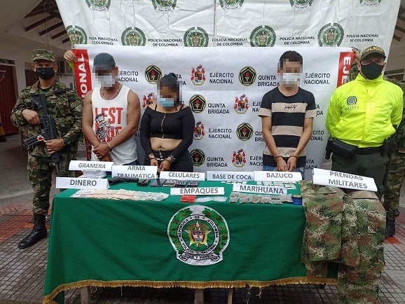 Añadió el oficial, “estas personas fueron dejadas a disposición de la autoridad judicial competente y deberán responder por los delitos de fabricación, tráfico, porte de sustancias alucinógenas y porte de prendas de uso privativo de las Fuerzas Militares”.