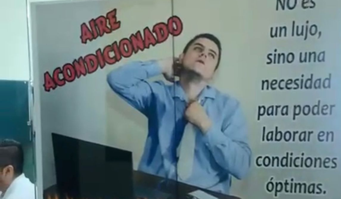 En los carteles los trabajadores dicen: “El ambiente en el sitio de trabajo resulta sofocante, por lo que es necesario efectuar constantes recesos para contrarrestar el calor.”