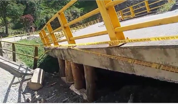 Sin embargo, en un afán de reparar el puente y solucionar el caos vehicular, la comunidad de San Andrés, Santander, denunciaron que con vigas de madera están tratando de evitar que termine de colapsar.