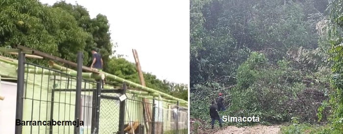 El primero de los hechos se presentó en el municipio de Simacota, en donde la comunidad reportó que debido a unas tormentas repentinas en la zona de Aguas Blancas y en el sector Simacota Yariquíes, algunas casas registraron desprendimiento de techos, además de caída de árboles sobre las vías.