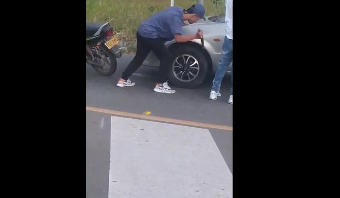 El joven guarda el enorme cuchillo y se sube a la motocicleta mientras le dice “daño por daño”. El copiloto se acomoda y se van tranquilamente del lugar, mientras el conductor del carro se queda pinchado.