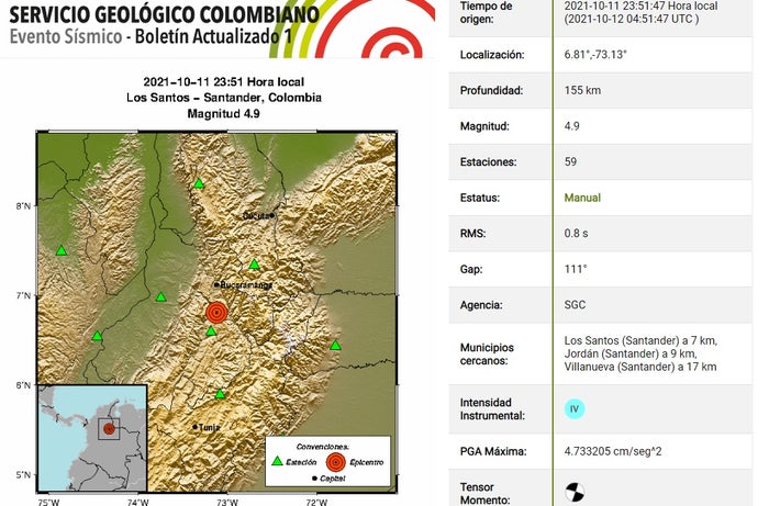 El movimiento telúrico estuvo localizado a 6 kilómetros del municipio Los Santos. Esta vez sus habitantes manifestaron sentir este fuerte temblor cuando faltaban tan solo 10 minutos para terminarse la noche en Colombia.
