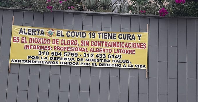 En el sector de Pan de Azúcar al sur occidente de Bucaramanga apareció instalado un pendón publicitario en el que se promociona el dióxido de cloro como la cura para la Covid-19.
