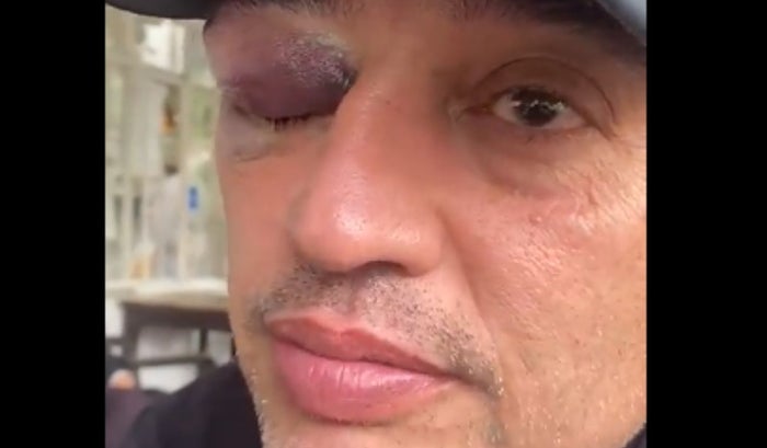 Con el ojo inflamado y morado Mauricio Hernández, hijo del exalcalde de Bucaramanga Rodolfo Hernández, hizo pública la denuncia del acto de intolerancia.