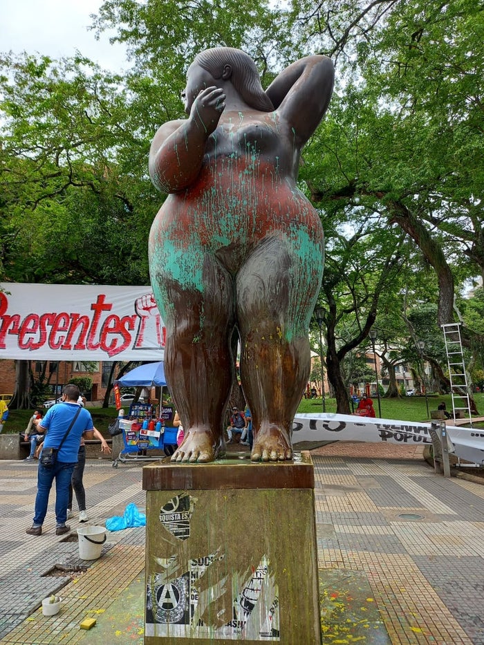 Tras las últimas jornadas de movilizaciones desarrolladas en Bucaramanga, un grupo de jóvenes afectó la escultura de ‘La mujer de pie desnuda’, más conocida como una de las ‘Gordas’ del artista Fernando Botero, ubicada en el parque San Pío, en Cabecera.