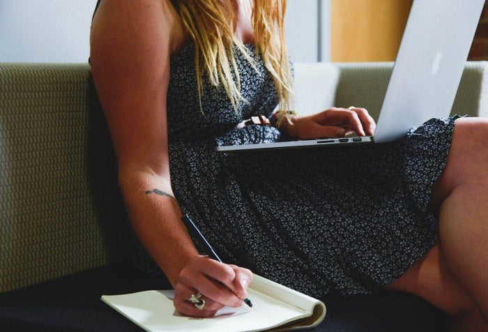 Mujer con computador estudiando
