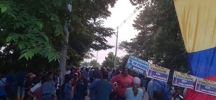 Los ambientalistas y comunidad en Puerto Wilches, Santander, madrugaron a protestar en rechazo a la decisión del Tribunal Administrativo en el que se reviven los proyectos pilotos de fracking Kalé y Platero.