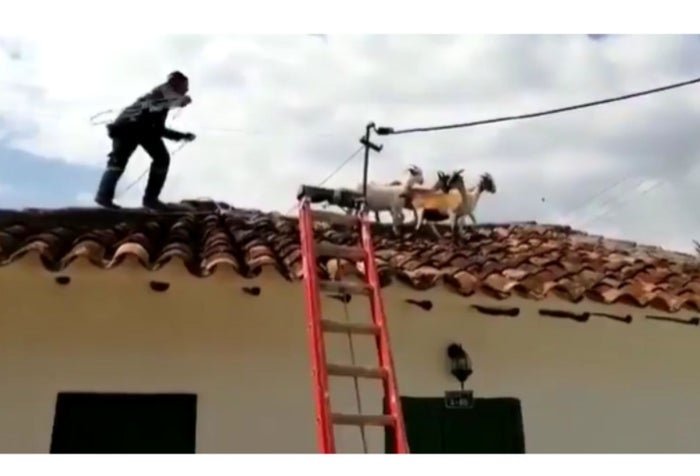 Con la ayuda de un lazo el bombero trata de atrapar a las cabras. En medio de este curioso hecho, dos de las cabras se lanzaron del techo sin mayores contratiempos.