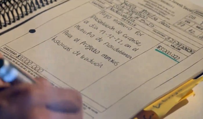 Ruth Rincón, quien vive de la venta de artesanías, indicó que el año pasado en el mes de diciembre la invitaron a participar en un evento artístico donde le dieron $100.000 pero le hicieron firmar una factura en blanco, que al parecer luego sería completada por la entidad responsable del contrato 3820 del 6 de diciembre de 2022, firmado por la secretaria de Cultura Mery Luz Hernández López.