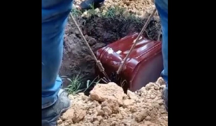 Sin embargo, lo que empezó a llamar la atención de los asistentes es que el lote donde iba a ser enterrado no tenía más de 1 metro de diámetro, pero sí era muy profundo, por lo que lo enterraron de pie.