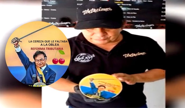 “Esta es una oblea del presidente Gustavo Petro que tiene una serie de ingredientes que están enfocados en todo lo que pagamos los microempresarios”, explicó Cristián Jiménez, de Tentaciones Dulces y Obleas.
