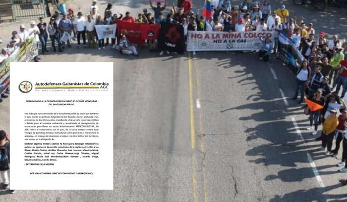 “En paro se hizo intermitente. Algunas personas salimos del territorio por amenazas a modo de panfletos que llegaron nuestras vías de comunicación. Dicen ser de las Autodefensas Gaitanistas de Colombia, las Autodefensas Unidas de Colombia unidad de Colombia y Águilas Negras”, expresó la líder ambiental.