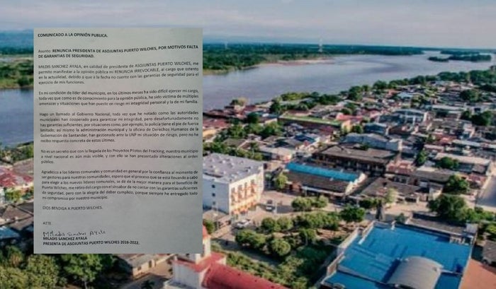 Ante las constantes amenazas contra su vida, la presidenta de Asojuntas de Puerto Wilches, Santander, presentó su carta de renuncia a la Gobernación y a la Alcaldía del municipio.