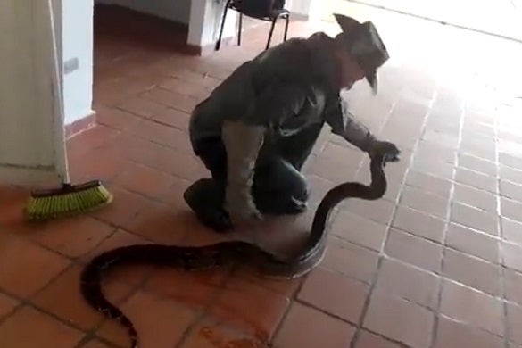 El Intendente Fakir Balta de la Policía Ambiental de la Metropolitana señaló “se recibe a través de la línea 123, la llamada de un habitante que nos informa que en la urbanización Portal del Bosque del municipio de Floridablanca se encuentra una serpiente de un gran tamaño en un baño de un salón social, luego de forma inmediata personal idóneo de la Policía ambiental y ecológica hacen presencia en el lugar donde efectivamente ingresan al baño y encuentran esta especie silvestre”.