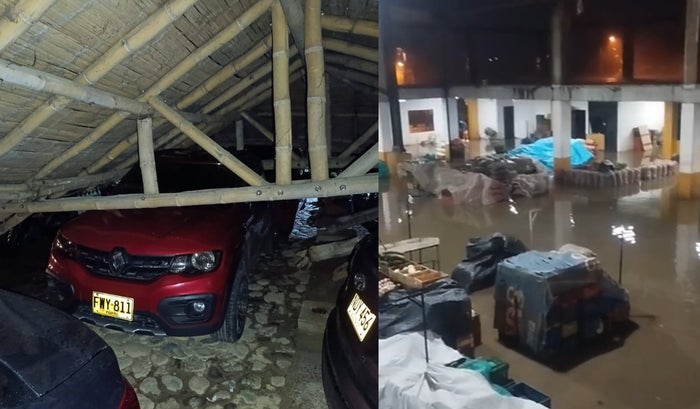 Una de las zonas más afectadas fue la plaza de mercado, donde el agua ingresó con fuerza, generando una corriente tipo arroyo que arrastró escombros y afectó los puestos de comercio. Además, varios vehículos resultaron dañados debido al colapso de una estructura que funcionaba como techo en la zona de parqueo.