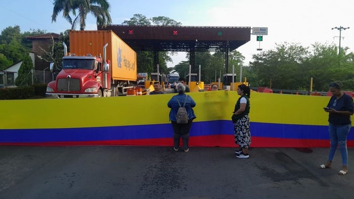 Protestas bloquean la vía al aeropuerto Palonegro de Bucaramanga, dejando a viajeros varados y caminando con maletas para no perder sus vuelos.