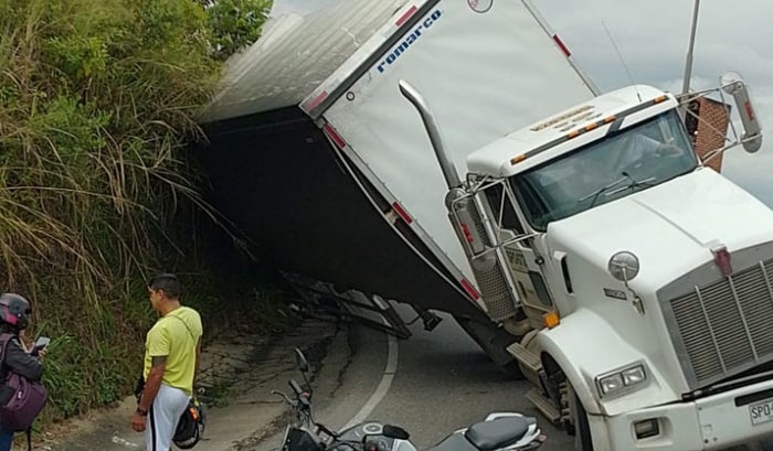 "Un vehículo que se trasladaba sentido norte - sur, de Bucaramanga a Rionegro, por la configuración de vía el tractocamión se desestabiliza al introducirse en una cuneta. Debido al peso que trae pierde la estabilidad y se va contra el barranco en su parte trasera, su carga sale y está produciendo la congestión que estamos tratando de contener", señaló Luis Pinzón, agente de la dirección de Tránsito de Bucaramanga.